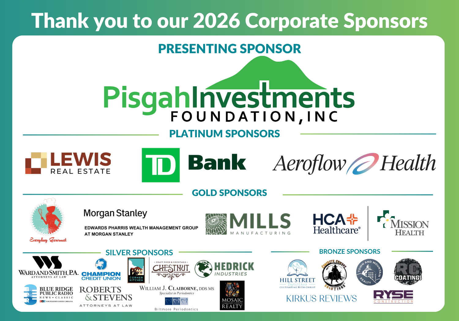 Corporate Sponsors receive benefits such as tickets to events, publicity, and links on Literacy Together’s website and social media. To become a Corporate Sponsor, email development@lit-together.org or call 828-254-3442 x206